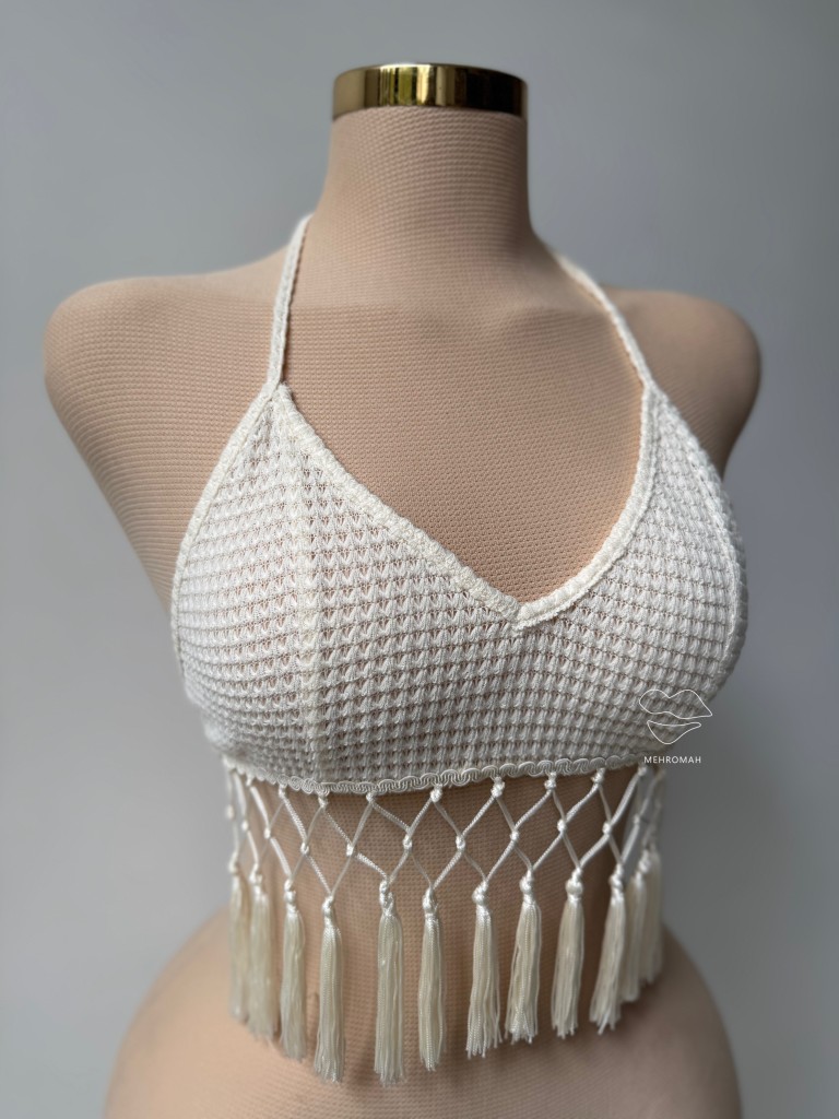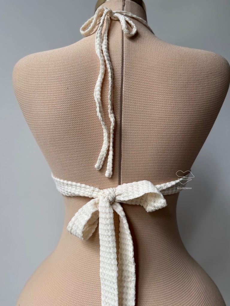 این محصول کاپ مثلثی دارد، از جنس بافت است و تنخوری زیبا ارائه میکند. زیبایی این محصول به دلیل استفاده از بافت و تکستچر زیبایی که دارد، انتخاب بسیار خوبی است. کاپ سینه محصول مثلثی شکل است؛ پشت سینه محصول با بند باز و بسته میشود و مدل گرهای دارد. در قسمت زیر سینه ریش ریش کار شده که زیبایی خاصی به استایل شما میدهد.
