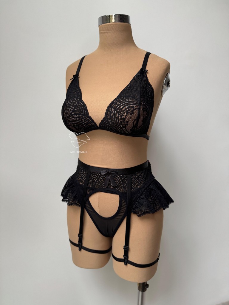 طراحی این محصول با استفاده از پارچه گیپور دانتل یکی از جذابترین لباس خوابهای فانتزی زنانه است. بالاتنه این محصول دارای سوتین کاپ مثلثی است و پشت سینه تک سگک دار و بندهای سرشانه با رگلاژ قابلیت تنظیم اندازه دارد. پشت سوتین دارای تک سگک است. پایین تنه محصول مدل دامنی دارد که از پشت با سه قزن در سه ردیف بسته میشود. این دامن به دو هولدر رگلاژدار متصل است. این هولدرها، قابلیت نگه داشتن جوراب و گارتر ران را دارند. شورت این ست بکلس است و از پشت قسمت کمی از روی باسن را پوشش میدهد. این محصول شامل رنگ مشکی و فری سایز مناسب برای کاپ 80 به بالا و سایزبدنی 36.38.40.42 در مهروماه شاپ موجود است.