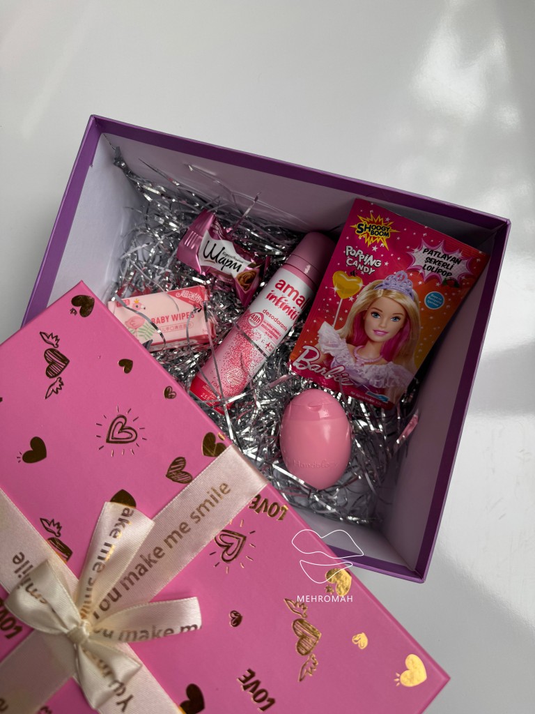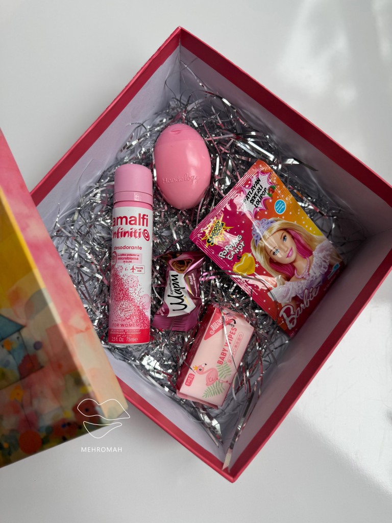 شامل کرم دست، اسپری، دستمال مرطوب، شکلات، کندی جرقهای باربی+پوشال.