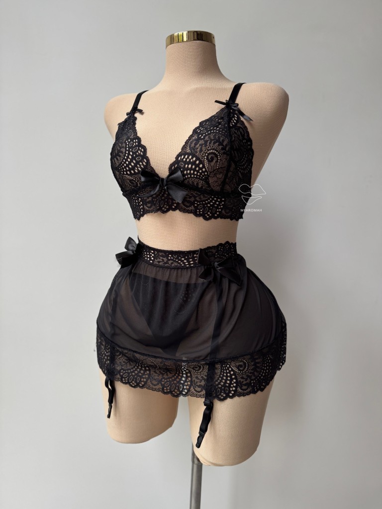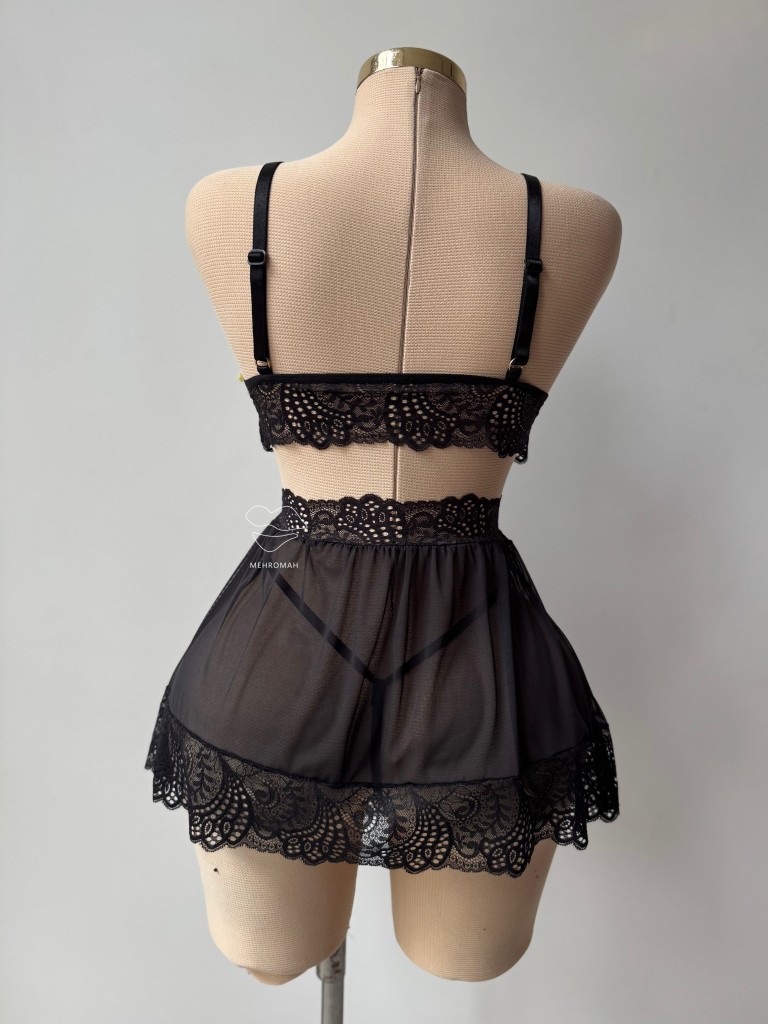 این محصول شامل بالاتنه مدل برالتی است. این بالاتنه بدون هیچگونه قزن و گیرهای طراحی شده. در قسمت زیر سینه و پشت سینه کشی کار شده است. بندهای سرشانه رگلاژدار و قابل تنظیم با اندازه بدن هستند. جنس بالاتنه برالت گیپور دانتل زیبایی است. کاپ سینه مثلثی است و به نسبت حجم سینه پوشش دهی دارد. مشخصه جالب این برالت استفاده از پاپیون در طراحی آن است که زیبایی محصول را دو چندان کرده است. پایین تنه این محصول مدل دامنی دارد که از جنس حریر شیشه ای است و در قسمت دور کمر و پایین دامن، تور دانتل کار شده است. این دامن دارای دو هولدر است که این هولدرها به جوراب بالازانو زنبوری متصل میشوند. این ست فانتزی دارای شورت لامبادا نیز هست. این شورت مدل قسمت پشت باسن تنها در خط باسن قرار میگیرد و در قسمت مثلثی جلوی آن، با طراحی دانتل روی بدن را میپوشاند. یکی از جذابیتهای خرید ست فانتزی برالت و دامن، ترکیبی از تنخور پرنسسی و اغواگرایانه محصول است. این ست فری سایز و مناسب برای 38.40 تا 44 تک رنگ مشکی قابل سفارش است.