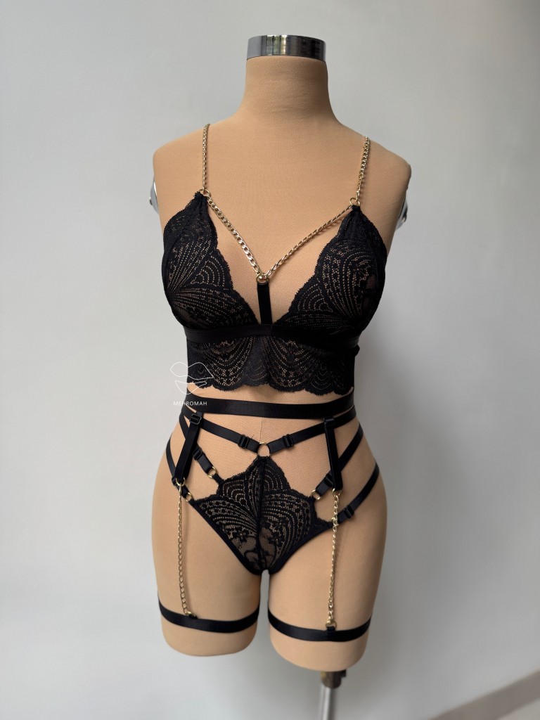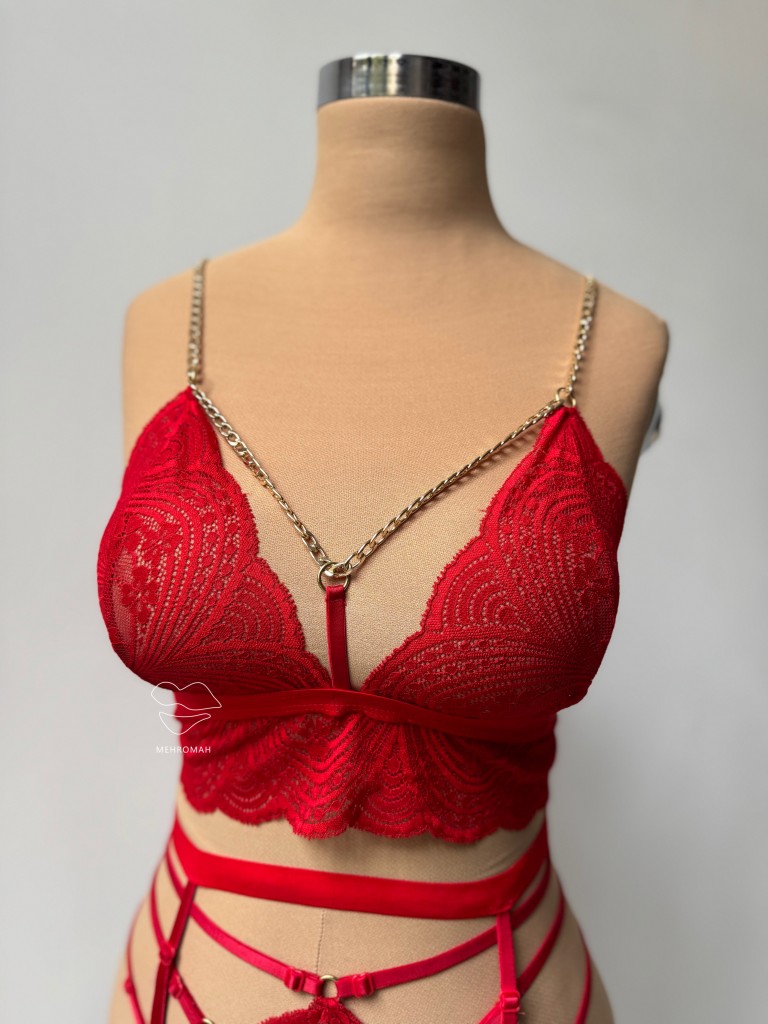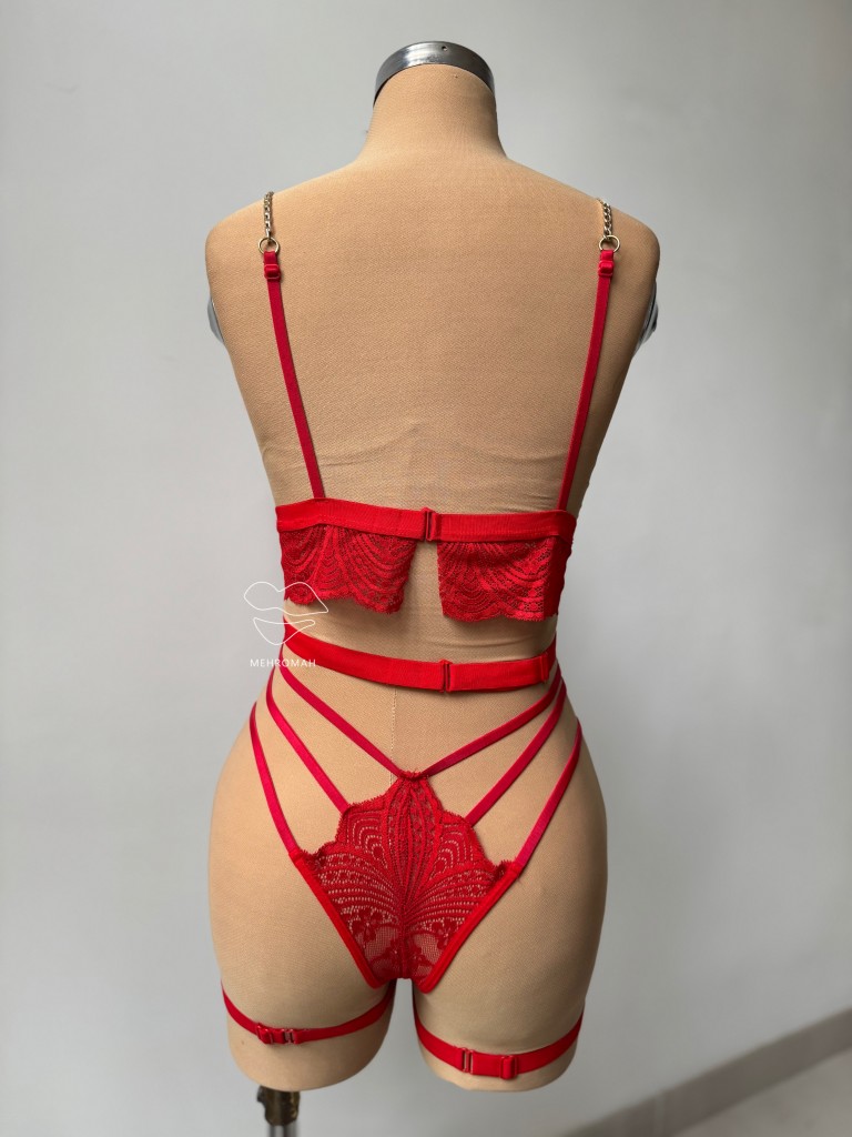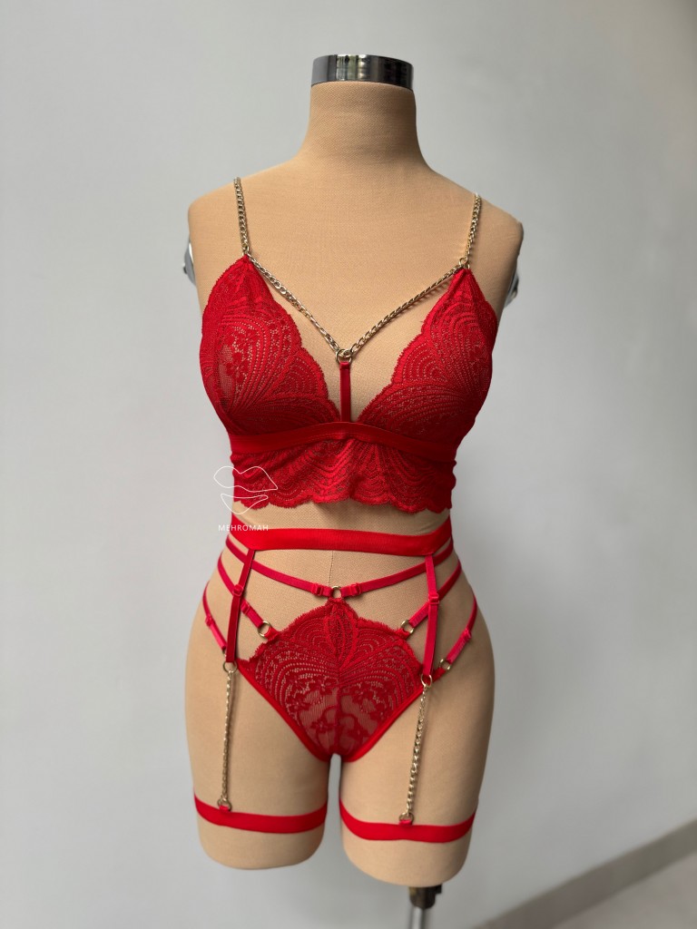 این ست از برند دنیز، یکی از جذابترین ستهای فانتزی زنانه است. این محصول شامل سوتین بالاتنه، شورت برزیلی و دو گارتر ران و رگلاژدار و قابل تنظیم است. خرید ست فانتزی همراه بسیار مناسبی برای موقعیتهای خاص و عاشقانه است. ویژگی قابل توجه این ست استفاده از رگلاژ در تمامی قسمتهاست. سوتین ست مدل برالت دارد از جنس گیپور ظریف است و بدن نمایی جذابی دارد. شورت ست مدل برزیلی است و در قسمت روی کمر و بندها مدل چند بندی و رگلاژدار دارد که تنخوری زیباتر ارائه میکند. بند سرشانه سوتین زنجیر کارتیر دار است و از پشت با تک گیره باز و بسته میشود. بندهای ست قابلیت تنظیم با رگلاژ گلد رنگ دارند. مشخصه اصلی این ست جذاب استفاده از زنجیر کارتیر در هارنس و بند سرشانه، همینطور در قسمت گارتر ران است. این کارتیر گلد رنگ به ست احساسی لوکس و مجلل میدهد. تنخور ست فانتزی یکی از جذاب ترین محصولات خرید لباس زیر فانتزی زنانه است. این ست در دو رنگ مشکی و قرمز و فری سایز مناسب سایز بدنی 36 تا 42 با کاپ 80 به بالا از طریق سبد خرید مهروماه شاپ اقدام کنید.