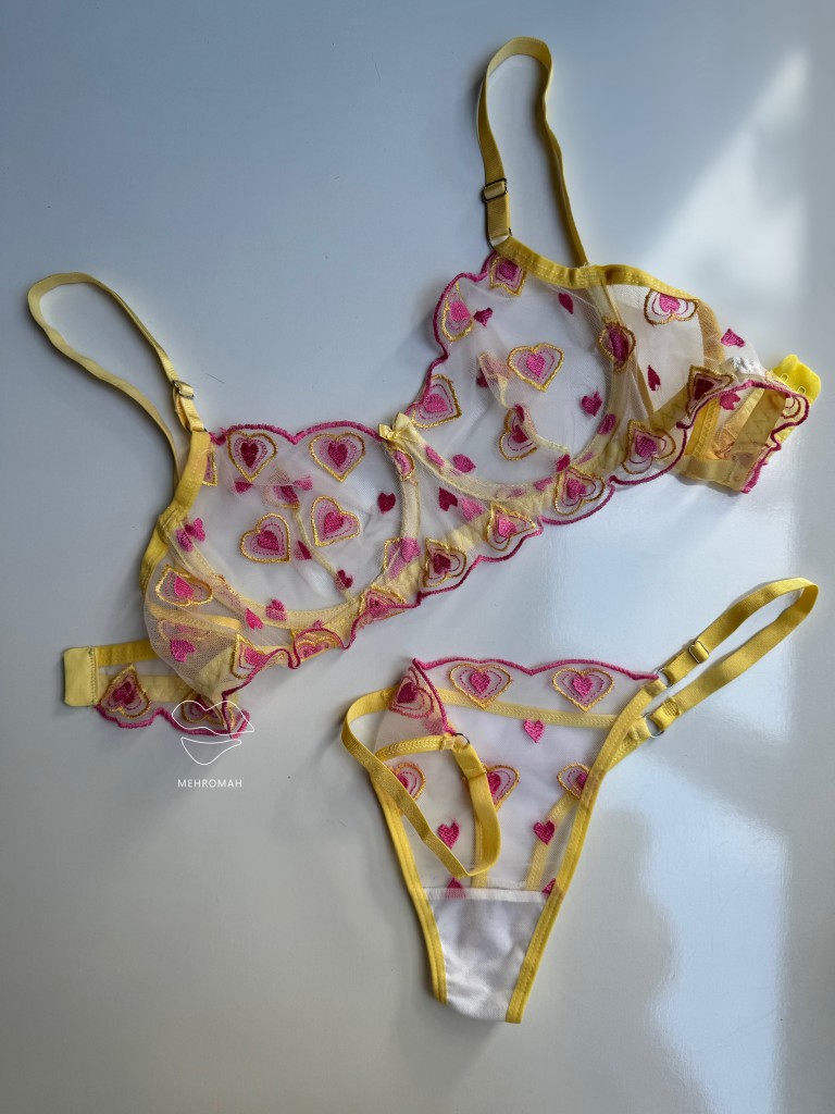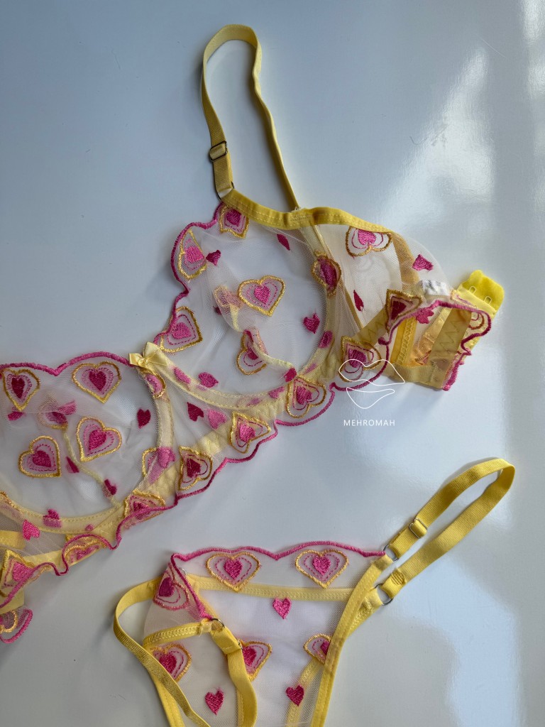 ست شورت و سوتین توری، یکی از جذابترین محصولات لباس زیر زنانه است. سوتین این ست دارای دو ردیف قزن سه تایی است. بند سرشانه سوتین رگلاژ دار است و قابلیت تنظیم اندازه را دارد. سوتین ست HANIS دارای فنر است؛ پایین تنه مدل بکلس دارد و دارای فاق نخی است. بندهای روی کمر شورت رگلاژدار و قابل تنظیم با اندازه بدن هستند. این ست لیمویی رویایی، شامل جنس تور گاز شیشه ای، با طرح قلبی است. سایزبندی این محصول شامل سایزهای 75.80.85.90 با کاپ B استاندارد از طریق سایت مهروماه شاپ قابل تهیه است.