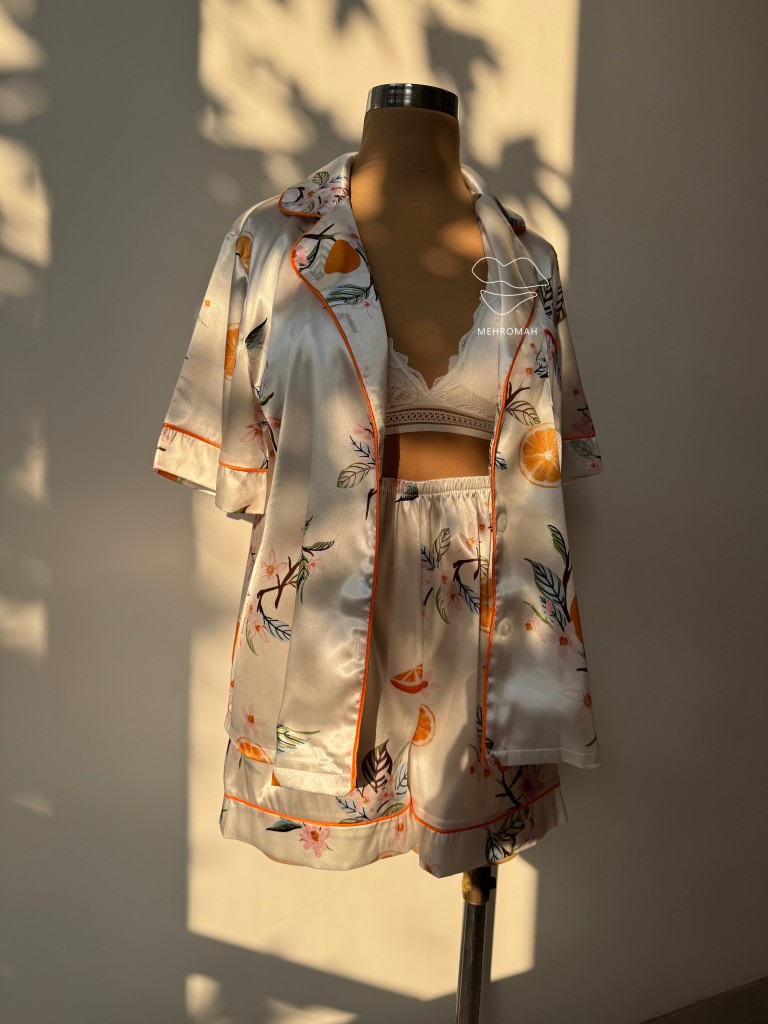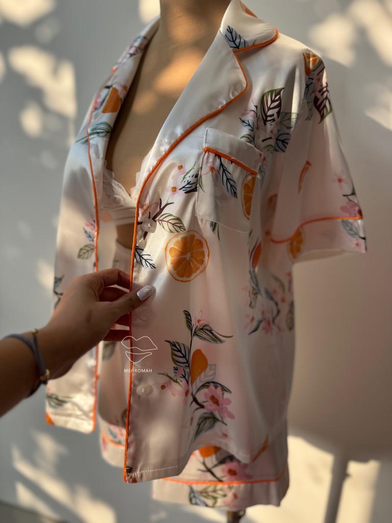 این محصول از جنس ساتن ابریشمی است و مناسب و سازگار با انواع پوست است. بالاتنه ست شامل بلوز آستین کوتاه مغذی دوزی شده است که ست را لوکس و زیبا نشان میدهد. این محصول در قسمت بالاتنه مغذی دوزی دارد و یک جیب پاکتی کوچک روی سینه سمت چپ قرار دارد. بلوز ست دکمه دار است و شامل یقه انگلیسی است. شورتک ست، کمر کشی است و از کشسانی نسبی برخوردار است. طراحی زیبای این ست ساتن، شامل طرح لیمویی جذابی است.