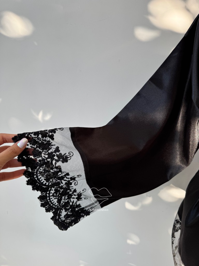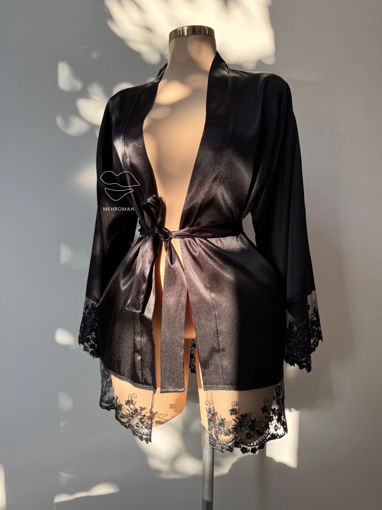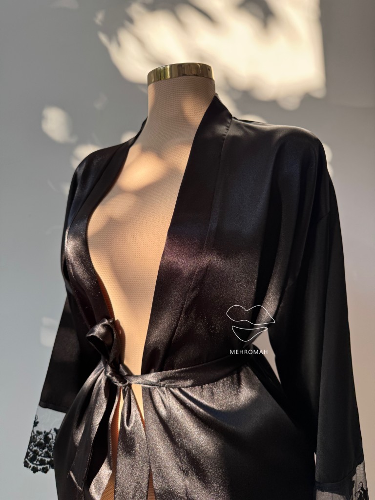 ویژگی متمایز کننده این ربدوشامبر از سایر محصولات بازار، ترکیب ساتن ابریشمی و گیپور دانتل است. در قسمت پایین ربدو و سر آستینها تور دانتل زیبایی کار شده که جلوه محصول را سنگین و شکیل میکند. این ربدو کوتاه است و در قسمت روی کمر دارای کمربند است. تنخور ست ساتن به دلیل جنس با کیفیت، بسیار شیک و زیبا است. ربدوشامبرها را میتوانید به عنوان لباس خواب ساتن و استایل لباس خانگی بخرید! این محصول شامل فری سایز و مناسب برای 36.38.40 تک رنگ مشکی در مهروماه شاپ موجود است. اگر برای خرید محصولات ساتن شک دارید، پیشنهاد ما به شما خواندن مقاله و انتخاب انواع ست ساتن به راحتی است.