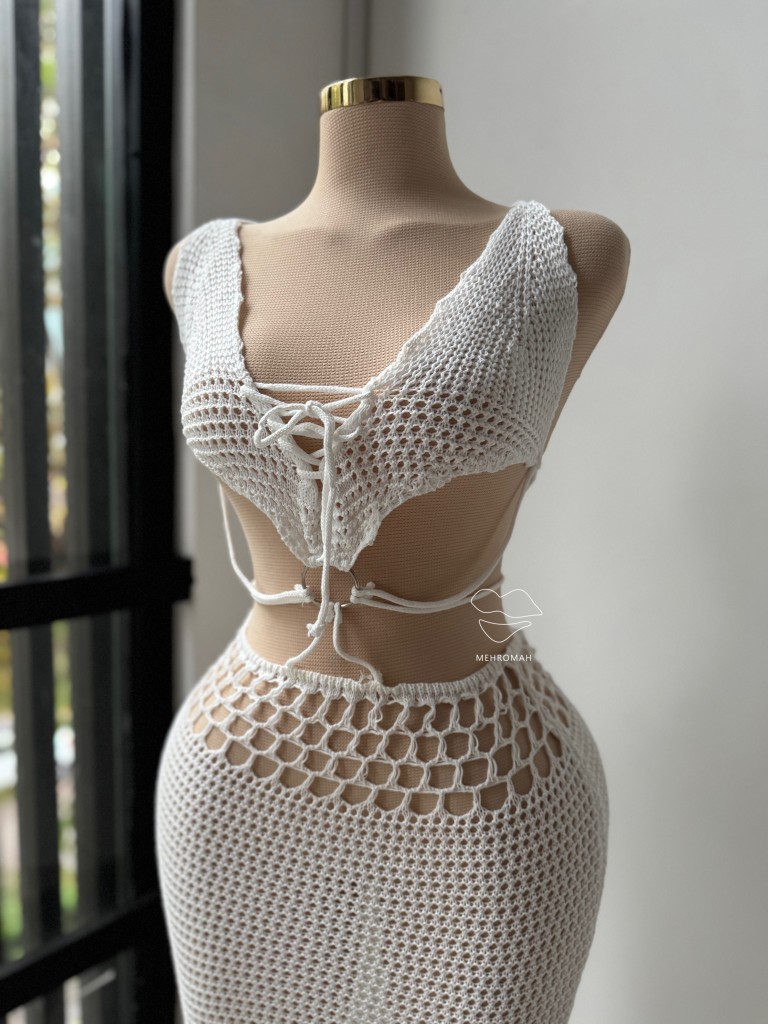 خرید رومایویی بافت با توجه به سلیقه شخصی شما متفاوت است. اگر طرفدار رنگهای روشن هستید، این محصول مناسب برای شماست. کاپ سینه این محصول مدل مثلثی دارد. در قسمت وسط سینه حلقه سیلور کار شده که از روی این حلقه بند بندی رد شده است. باز و بسته شدن این رومایویی با بندهای گردنی و مدل گرهای امکان پذیر است. این بندها در قسمت گردن گره میخورند و در قسمت پشت بدن نیز با گره بسته میشوند. پایین تنه رومایوای بافت دامنی است و به دلیل تکستچر آن، تنخوری بدن نما و خاص دارد. برای خرید این رومایویی از طریق سایت مهروماه شاپ و فری سایز مناسب 38 پر، 40.42 ، تک رنگ سفید میتوانید اقدام به خرید کنید.