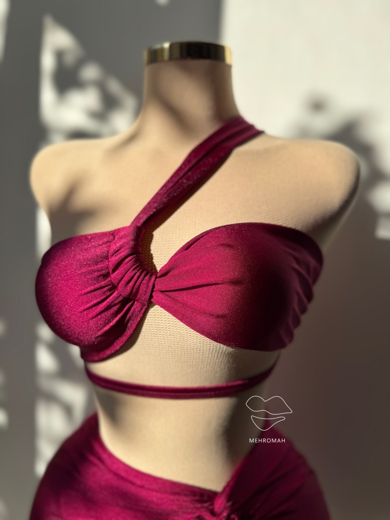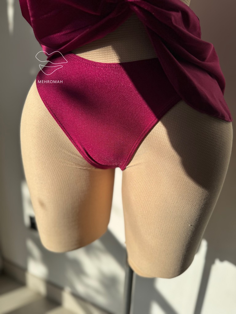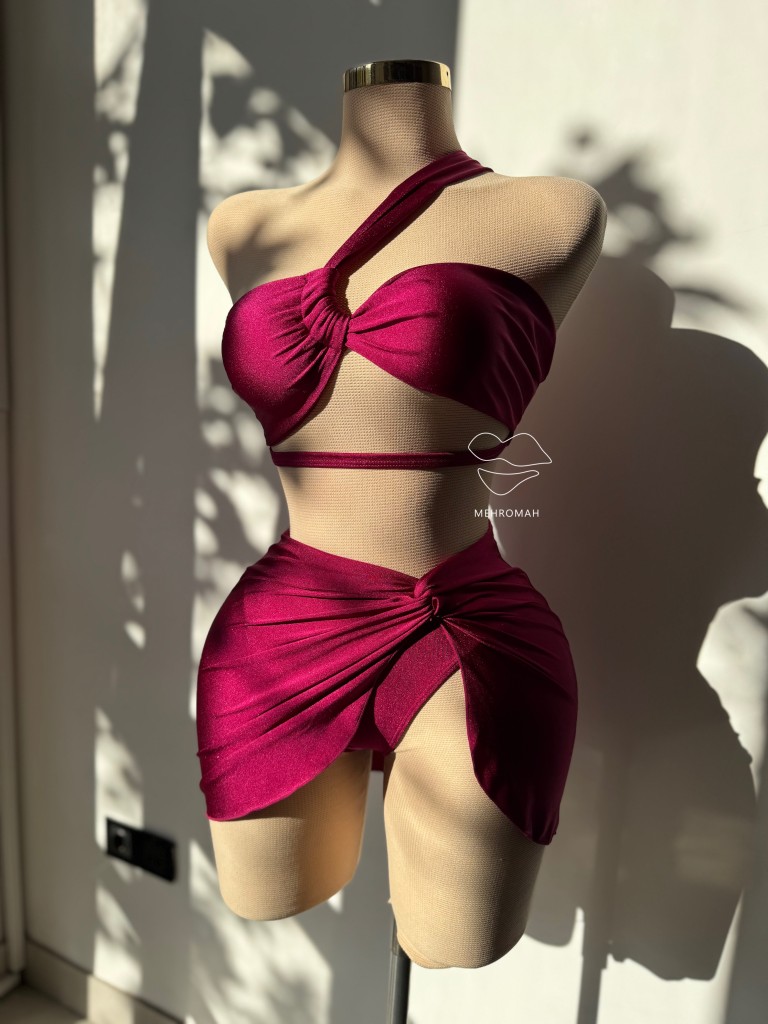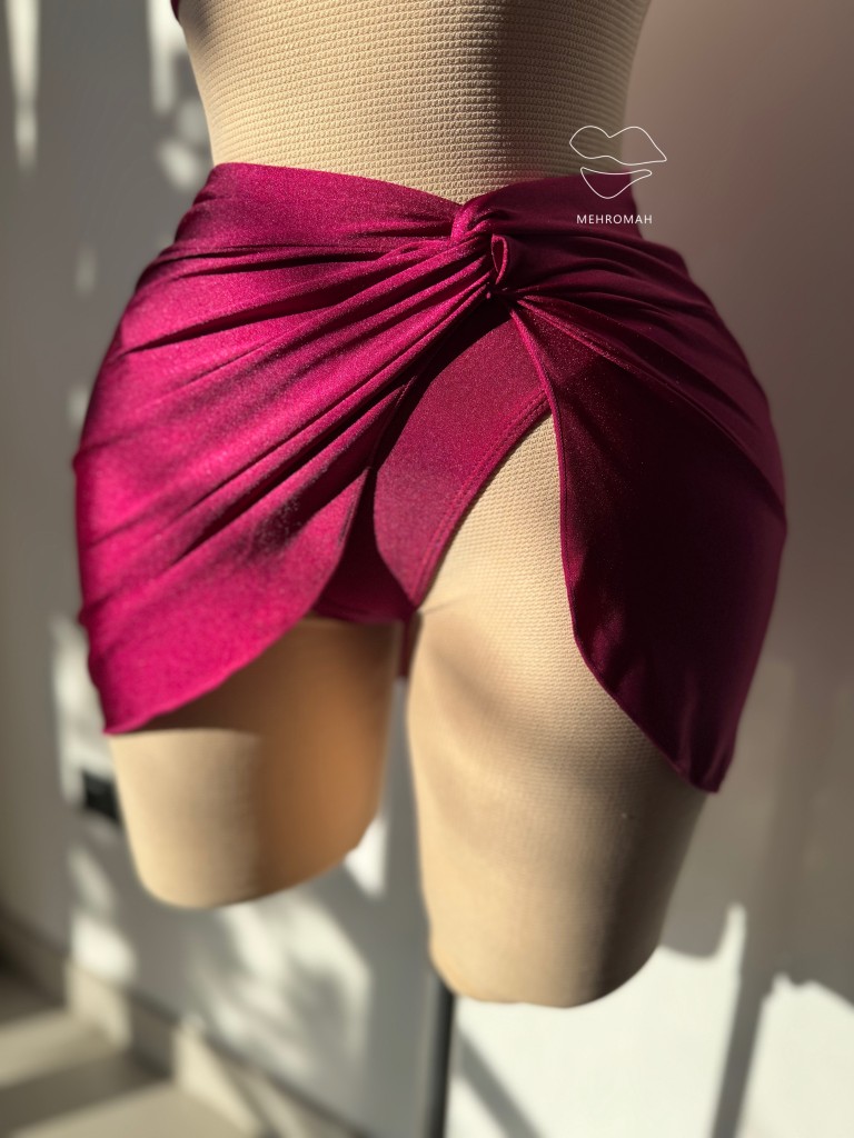 این بیکینی دارای بالاتنه مدل رومی و کمر دار است. قسمت کاپ سینه پددار متحرک است. شورت این ست مدل برزیلی و دو لایه مایویی است. بیکینی پایین تنه این ست دولایه است و تنخوری ساده و راحت دارد. این محصول از کالکشن شین به دلیل خاص بودن، مناسب برای استایل کردن در ساحل و تفریحات ساحلی است. پایین تنه ست بیکینی شامل رومایویی دامنی است، رومایویی ها به شما برای راحتی استایل ساحلی کمک میکنند. مدل این رومایویی، جلو گره است. رنگبندی این محصول ارغوانی جذاب است و شامل سایز S از کالکشن شین میتوانید از سایت مهروماه شاپ تهیه کنید.