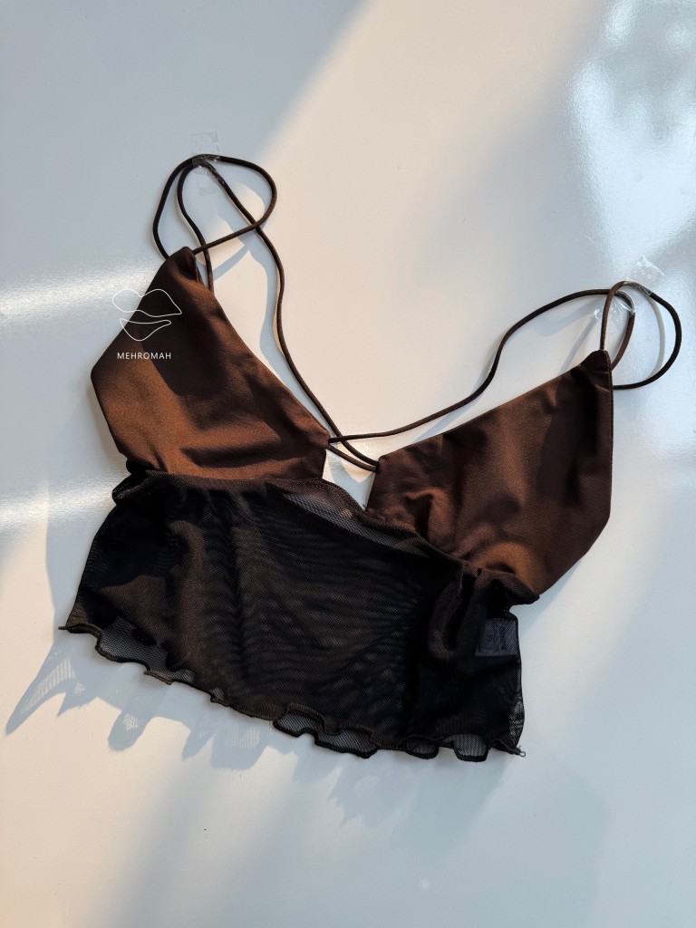 این محصول از جنس حریر شیشهای، یکی از رویاییترین محصولات بالاتنه است. بندهای کراپ بند ماکارونی و ظریف هستند. این کراپ با رنگ قهوهای، حسی کلاسیک به مخاطب منتقل میکند. قسمت سینه کراپ دولایه است و کاپ مثلثی دارد. کراپ تاپ قابل استایل با شلوار و شلوارک، استایل با دامن، استایل در زیر کت، وست و به طور کلی یکی از آیتمهای بسیار کاربردی سبد خرید هستند. کراپتاپ حریری بند بندی به دلیل داشتن بندهای ظریف سرشانه که از وسط سینه رد میشود، تنخوری خاص ارائه میکند.