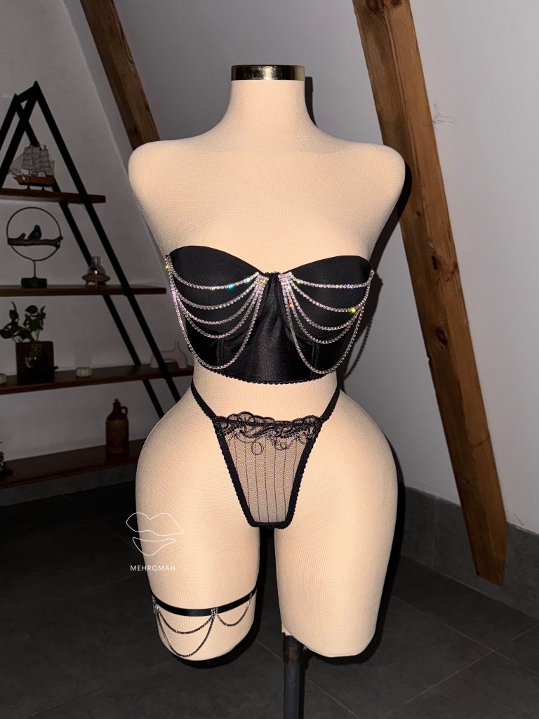 کرست مجلسی، مدل دکلته دارد. تزئین جذاب این محصول نگین دار آویزی است که تنخوری زیبا ارائه میکند. این برالت کاپدار است که فرم سینه را لیفت شده و پر نشان میدهد. در قسمت کاپ فنر تعبیه شده که از سینهها حمایت و پشتیبانی میکند. روی کاپ سینه تعدادی آویز زنجیری نگین دار کار شده که زیبایی تنخور را بیشتر میکند. در پشت سینه این محصول چهار ردیف قزن سه تایی طراحی شده که تنظیم اندازه را ممکن میکند. در قسمت زیر سینه کش پهن کار شده که کشسانی دارد و از سینهها حمایت میکند. کرست مجلسی یکی از آیتمهای لباس زنانه است که به راحتی قابل استایل کردن است. این محصول شامل سایز 75,80,85 با کاپ B قابل سفارش است. این محصول، سفارشی است و از طریق سایت مهروماه شاپ قابل تهیه است.
